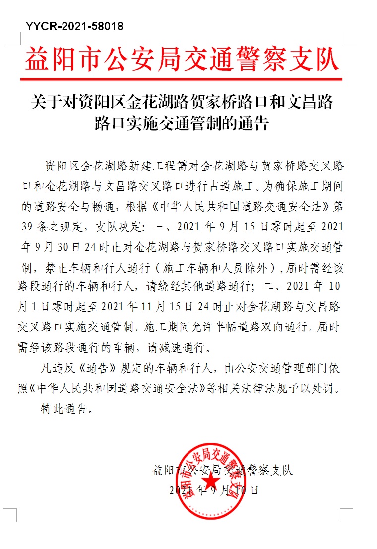 关于对资阳区金花湖路贺家桥路口和文昌路路口实施交通管制的通告(YYCR-2021-58018)