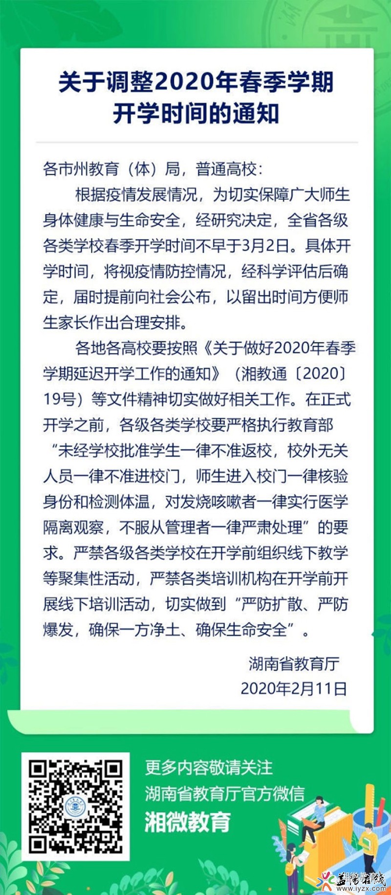 湖南省教育厅:各级各类学校开学时间不早于3月2日