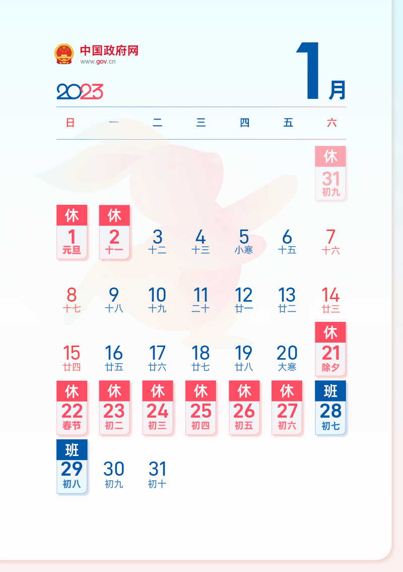 二、春节:1月21日至27日放假调休,共7天。1月28日(星期六)、1月29日(星期日)上班。