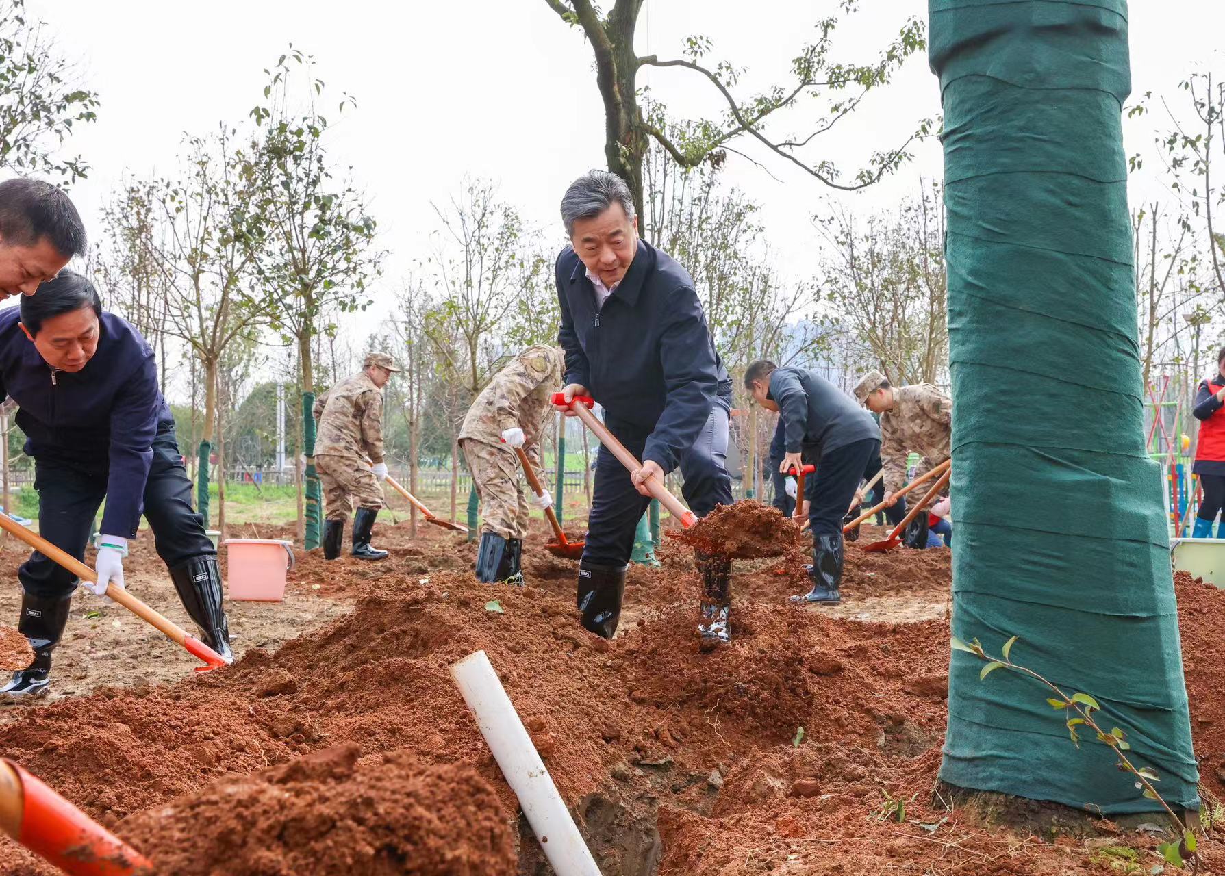 微风和煦,草木萌发,处处洋溢着勃勃生机。陈竞、彭建忠等市领导来到植树点,拿起铁锹等工具,与干部群众一起忙活起来。大家分工协作、相互配合,挥锹铲土、扶苗填土、踏土夯苗、提桶浇水……合力种下香樟、水杉等树苗,现场一派忙碌景象。