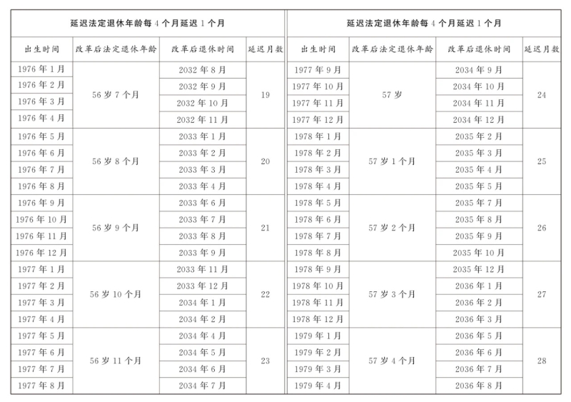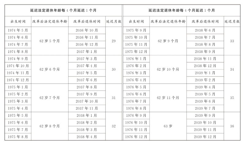 第一条 从2025年1月1日起,男职工和原法定退休年龄为五十五周岁的女职工,法定退休年龄每四个月延迟一个月,分别逐步延迟至六十三周岁和五十八周岁;原法定退休年龄为五十周岁的女职工,法定退休年龄每二个月延迟一个月,逐步延迟至五十五周岁。国家另有规定的,从其规定。