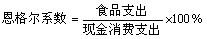 恩格尔系数 指食品支出在现金消费支出中所占的比例。计算公式为: