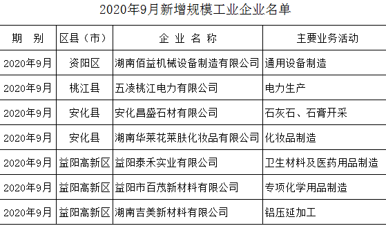 2020年9月底,益阳市7家新投产(新开业)企业通过申报纳入规模以上工业统计范畴获得通过,全市当年新增规模以上工业企业达62家。