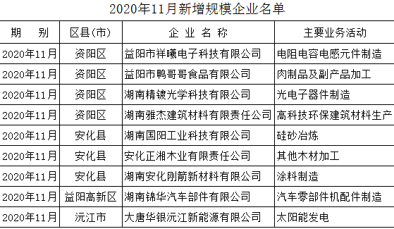 2020年11月,益阳市9家新投产(新开业)企业通过申报纳入规模以上工业统计范畴获得通过,全市当年新增规模以上工业企业达78家。