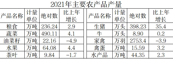 全年粮食播种面积548.87万亩,增长0.2%;粮食总产量236.24万吨,增长2.9%。出栏生猪398.23万头,增长35.4%;出栏牛8.9万头,下降0.2%;水产品产量44.35万吨,增长2.3%。