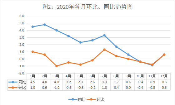 从同比指数看,2020年1-12月CPI同比涨幅分别为4.5%、4.8%、4.0%、3.2%、2.3%、2.6%、3.3%、1.7%、0.6%、-0.4%、-0.8%、0.6%,下行态势明显。对同比指数影响最大的是食品类,除了10-11月,影响CPI上涨约3.98%、4.77%、4.15%、3.40%、2.58%、2.93%、3.81%、2.11%、0.99%、0.64%。见图2。