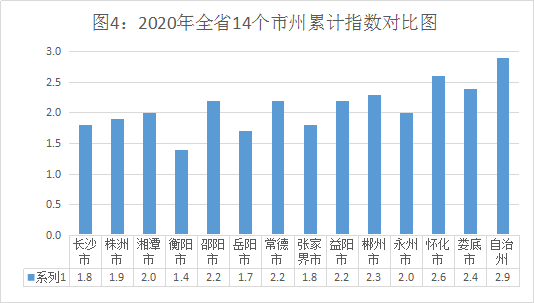 2020年,益阳居民消费价格同比上涨2.2%,涨幅在全省各市州中排名第六位。最高的是湘西自治州同比上涨2.9%,最低的是衡阳市同比上涨1.4%。见图4。