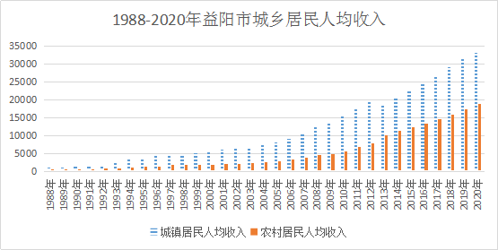 中国共产党成立之初,由于反动统治的腐朽、地主阶级的残酷剥削,再加上连年的军阀混战,社会生产力低下,人民生活极度困苦。随着土地改革、对外开放、经济体制改革、城镇化发展等政策的实施,我国社会经济不断发展,人民生活不断改善,益阳市居民收入不断实现新的突破。据历史资料显示,1952-2020年益阳市城镇居民人均可支配收入从125元增加到33274元,增长265.2倍,年均增长8.6%;农村居民人均收入从43元增加到18818元,增长436.6倍,年均增长9.4%。100年间,益阳市城乡居民人均收入实现多次突破:城镇居民人均收入在1988年达到千元级,2007年突破1万元,2014年突破2万元,2019年突破3万元;农村居民人均收入在1994年达到千元级,2013年突破1万元。2020年,益阳市城乡居民收入差距不断缩小,全面建成小康社会取得伟大历史成就,决战脱贫攻坚取得决定性胜利。
