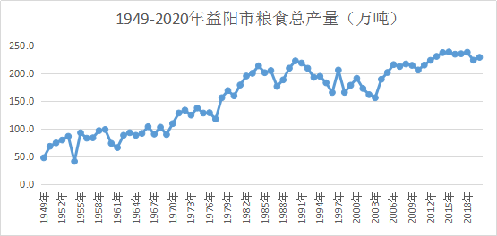 1949年,益阳市粮食总产量仅48.4万吨,粮食亩产量123.7公斤,1978年十一届三中全会后,益阳农村开始推行家庭联产承包责任制,赋予农民较大生产自主权,大大解放了生产力,1979年全市粮食总产量增加到169.6万吨,比建国初期增长了2.5倍,年均增长4.3%。粮食亩产量较1949年翻了一倍多,达到265.6公斤。2020年益阳市粮食总产量达到229.6万吨,较新中国成立之初增加181.2万吨,增长3.7倍,粮食亩产量达到419.2公斤。粮食产量的稳步提高,确保了中国人的饭碗始终牢牢端在自己手上。