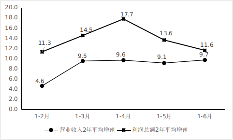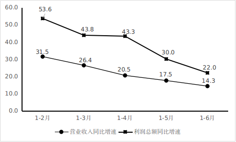 上半年,在上年基数效应的作用下,全市与全国、全省趋势一致,规模工业企业主要效益指标均呈现高开低走态势。全市完成营业收入1325.8亿元,同比增长14.3%,高于上年同期9.1个百分点,但相较今年前几个月分别回落17.2个、12.1个、6.2个及3.2个百分点;全市实现利润总额56.2亿元,同比增长22.0%,高于上年同期20个百分点,但相较今年前几个月分别回落31.5个、21.7个、21.2个及7.9个百分点。