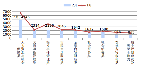 (五)社会保险。2月,社会保险事件共2999件,环比增加2.4%,咨询类占90.5%。社保相关事件约占49.8%,医保相关事件占34.5%,主要反映社保卡激活、退休金发放、密码修改、灵活就业参保、养老保险缴费基数、社保转移、查询缴费记录、社保卡补办、医保补缴、医保报销时间过长、查询余额、异地就医备案等。