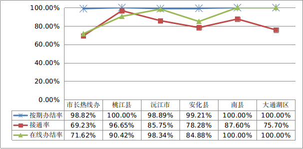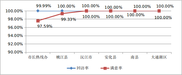 全市工单回访满意率为90.89%,与上月基本持平。赫山区、资阳区、高新区、安化县、南县和市住房和城乡建设局、联通公司、市中心医院、市生态环境局、市银保监分局、保险协会满意率未超过90%。