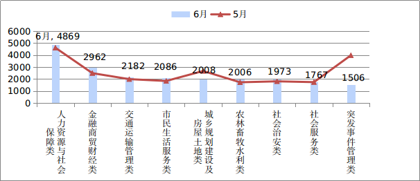 (五)通信服务投诉。6月,通讯服务类事件851件,环比增加12.4%。主要反映携号转网、运营商擅自开通业务和更改套餐、号码注销、网线修复、网络电视维护等。