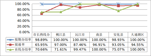 11月,共形成转办工单9731件,较上月增加6.69%。全市工单按期反馈率为98.96%,较上月下降0.82个百分点,赫山区、资阳区、安化县、桃江县、南县、高新区、市城管执法局、市住房和城乡建设局、移动公司、交警支队、市交通运输局、市公安局、市卫生健康委、中燃公司、供电公司、市中心医院、银保监分局、保险协会、城市学院、资江风貌带建设指挥部、文旅广体局未达到100%。