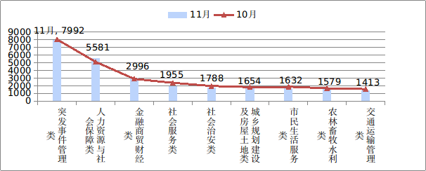 (一)公共卫生事件。11月,公共卫生事件7973件,环比下降0.5%。主要咨询健康码黄码申诉程序、疫情防控政策、核酸检测点等。11月,国内疫情形势严峻,省内疫情多点频发,疫情防控相关的投诉增加,主要反映:外省回益被阻止下高速、因无24小时核酸阴性证明被医院拒绝就诊、学校要求学生持核酸阴性证明入校、核酸检测排队人员多、隔离费用高等问题,市12345热线耐心安抚群众情绪,积极解释防疫政策,及时交办、跟踪和督办,切实解决群众困难。