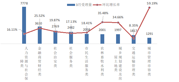 从受理事件大类分析:人力资源和社会保障领域诉求仍然最多,共7778件;城市管理市容类的诉求环比增长率最高,达59.19%。