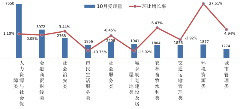 从受理事件大类分析:10月环境资源类诉求增长较多,同比增长27.51%。