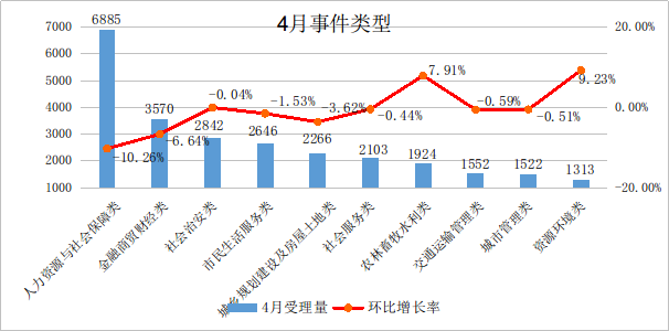 从受理事件大类分析:4月较3月受理事件类型涨幅不大,资源环境类环比增长9.23%;农林畜牧水利类环比增长7.91%。