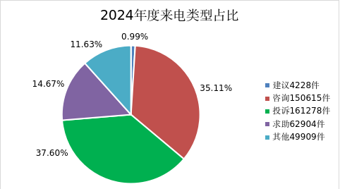 1.从来电类型分析:投诉类诉求占比较高,共161278件,占比37.60%,其次是咨询类,共150615件,占比35.11%。