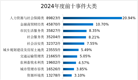 2.从受理事件大类分析:人力资源和社会保障领域诉求最多,共89823件,占比20.94%;金融商贸财经类45870件,占比10.70%;市民生活服务类35827件,占比8.35%。