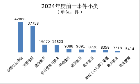 (一)各类社会保险。2024年,共办理相关诉求42868件,占全市工单量10.17%,同比减少21.45%。其中,在线答复群众39684件,在线办结率92.57%。问题集中在社保缴纳、生存认证、医保报销、异地就医备案、养老金发放不及时等方面。