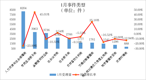 从受理事件大类分析:1月份,受理事件数量排名前三的事件大类为人力资源与社会保障类8204件,市民生活服务类3963件,金融商贸财经类3736件。