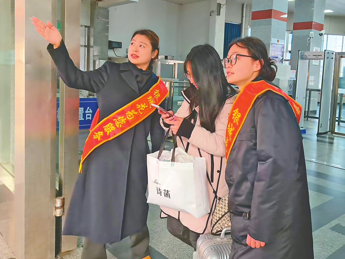 “银城花”服务队队员正在服务旅客。周颜摄