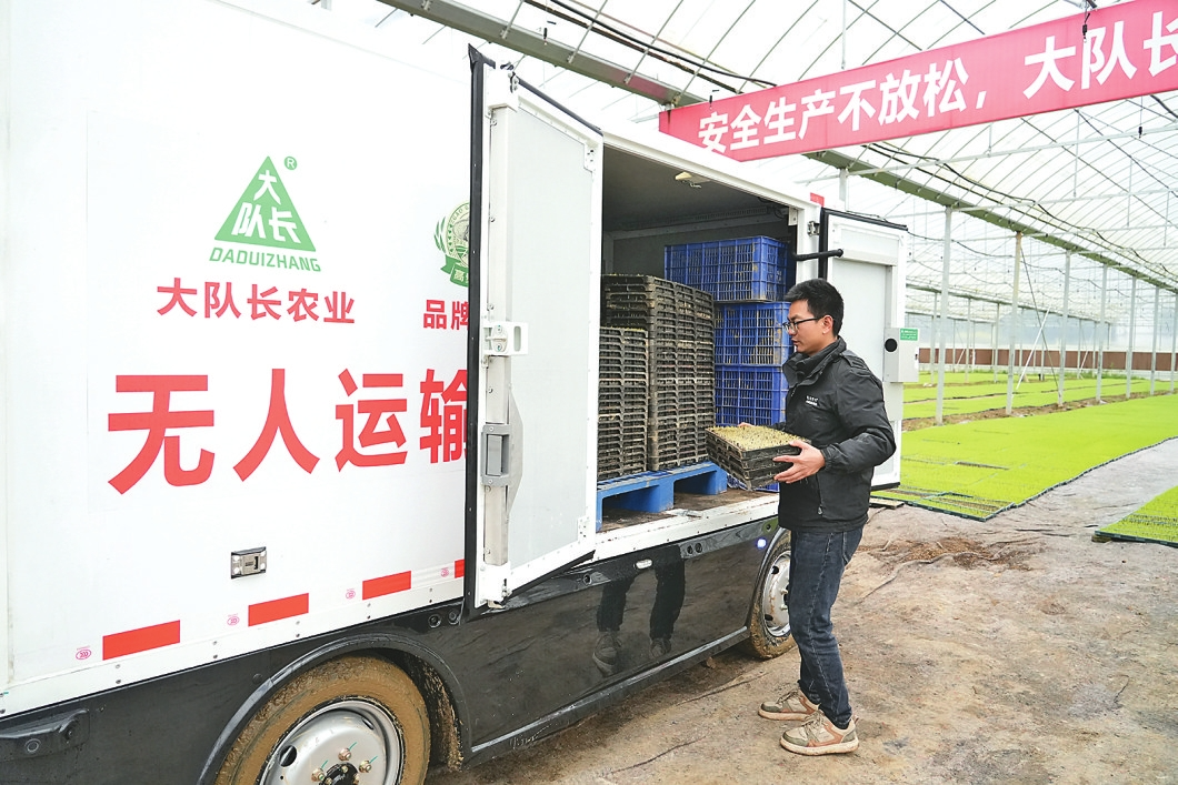 桃江县大队长农业公司用无人车运送秧盘。黄云摄