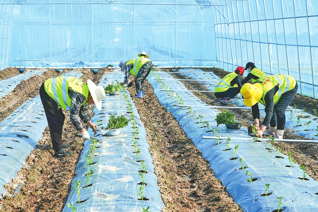 南县华阁镇新安村辣椒种植基地的温室大棚里,农民抢抓农时移栽辣椒苗。刘馨予摄