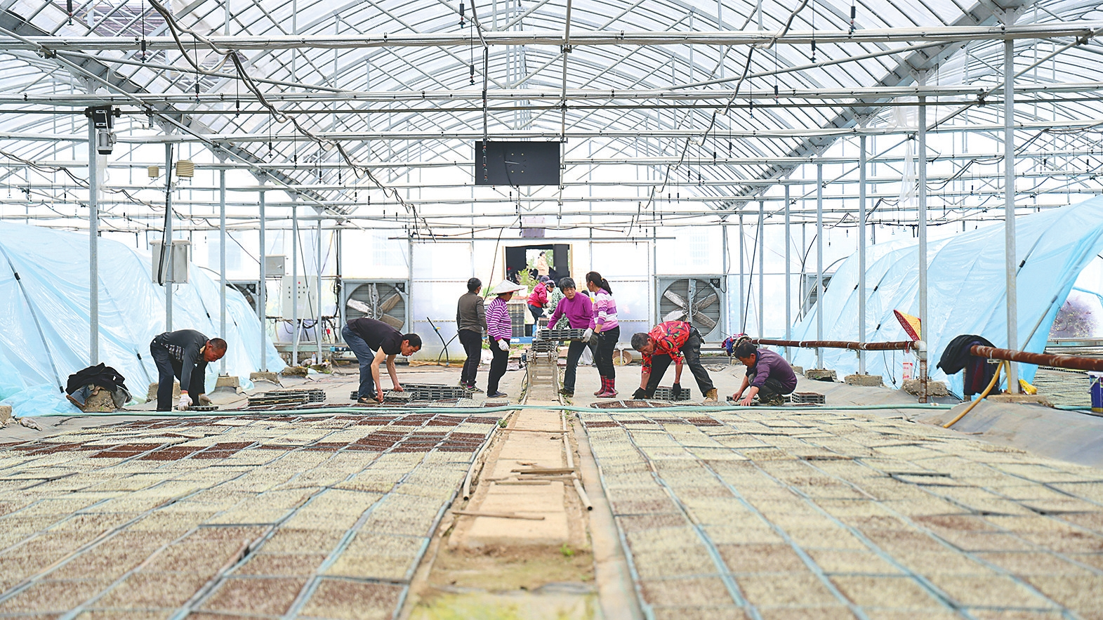 ▲资阳区南方智能育秧苗中心,农民将一盘盘秧苗摆放整齐。 钟浩摄