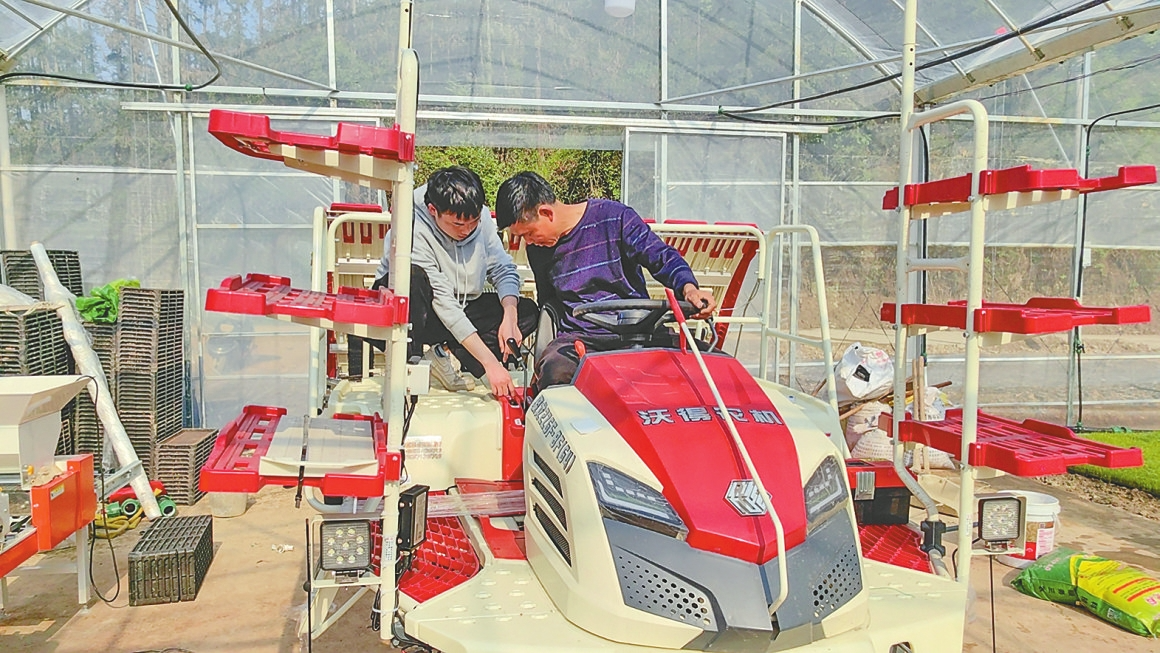 ▲ 安化县龙塘镇农技员指导农民操作插秧机。曹文进摄
