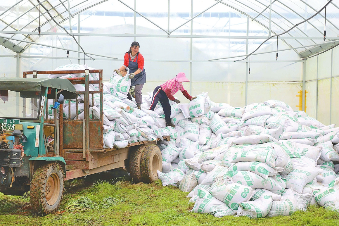 ▲ 大通湖区金盆镇种植大户在卸下育秧基质土。(大通湖区融媒体中心供图)
