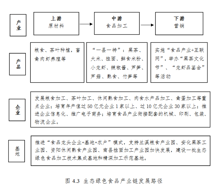 产业链基地建设:把握生态绿色食品产业链的关键环节,聚焦生产端、加工端、市场端和服务端,持续推广“食品龙头企业+基地+农户”模式。推进“一县一特”向“一特一片”发展,加速黑茶、大米、挂面、小龙虾、竹笋、休闲食品、芦笋、芦菇等产业集聚发展。支持兰溪粮食产业园、安化黑茶工业园、资阳休闲熟食产业园、南县挂面加工产业园加快发展,建设一批生态绿色食品加工技术集成基地和精深加工示范基地。