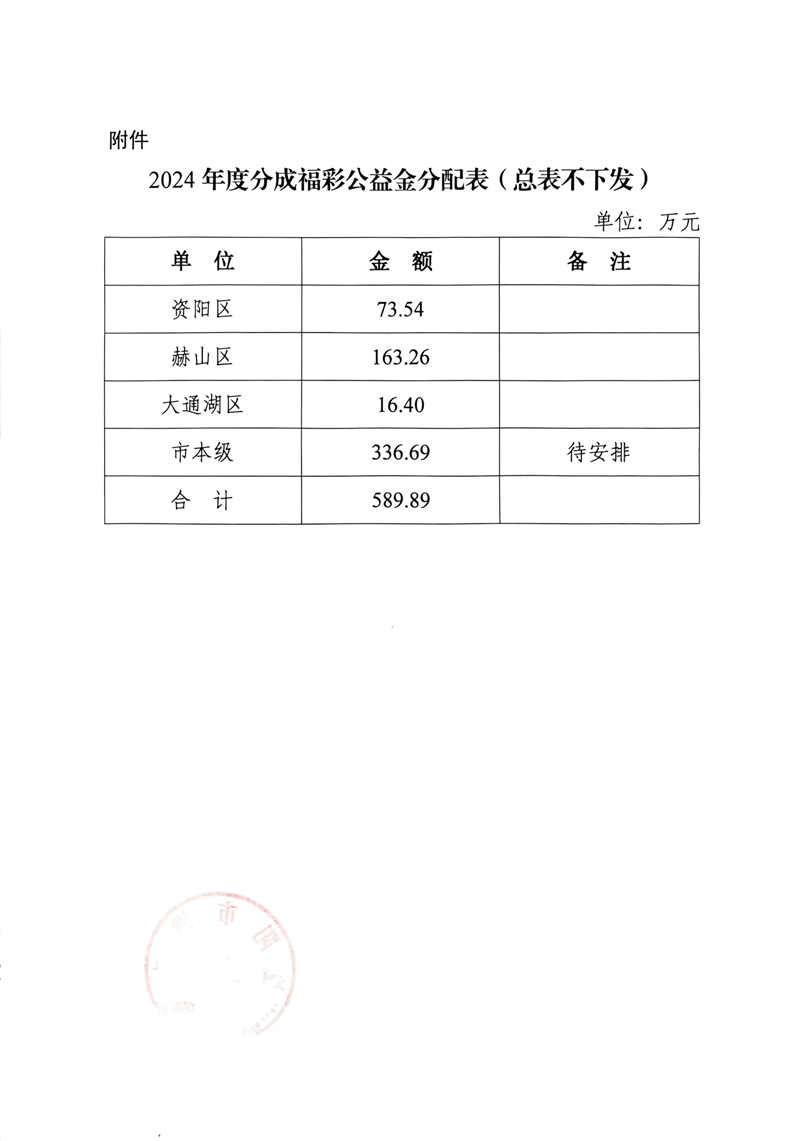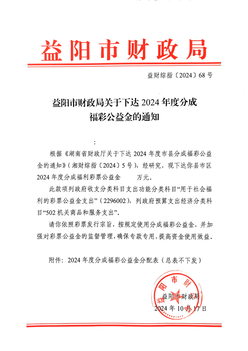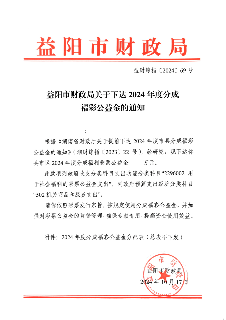 益阳市财政局关于下达2024年度分成福彩公益金的通知(1)
