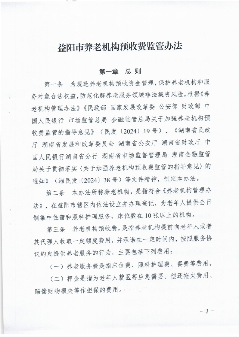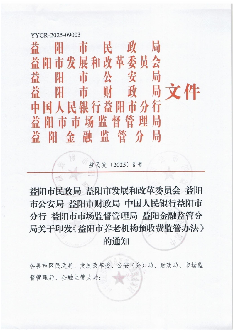 益阳市民政局 益阳市发展和改革委员会 益阳市公安局 益阳市财政局 中国人民银行益阳市分行 益阳市市场监督管理局 益阳金融监管分局关于印发《益阳市养老机构预收费监管办法》的通知 益民发[2025]8号