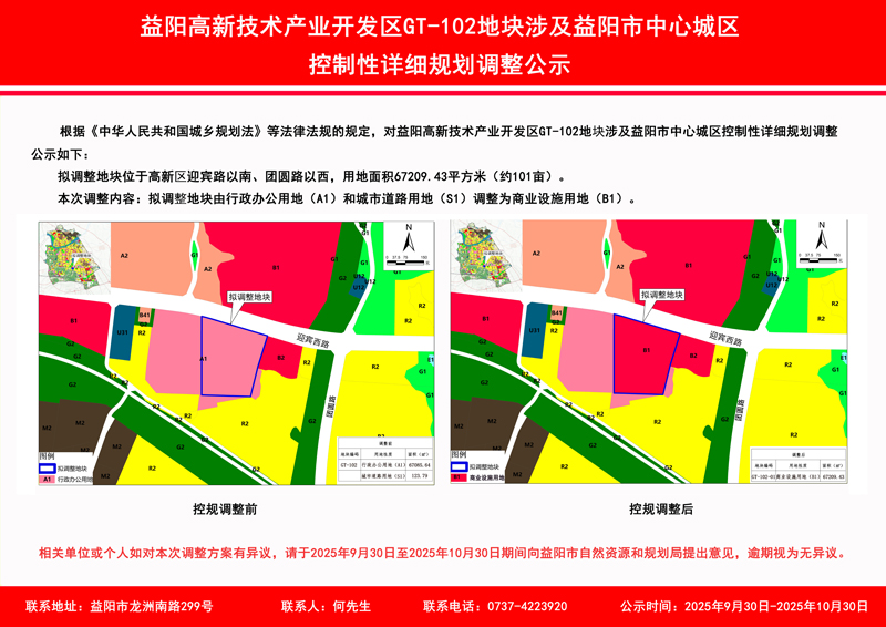 益阳高新技术产业开发区GT-102地块涉及益阳市中心城区控制性详细规划调整公示