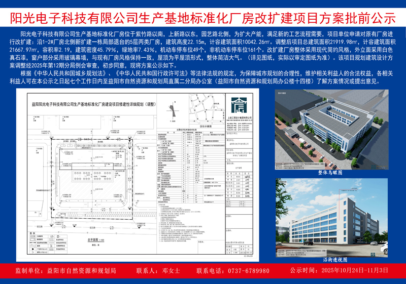 阳光电子科技有限公司生产基地标准化厂房改扩建项目方案批前公示