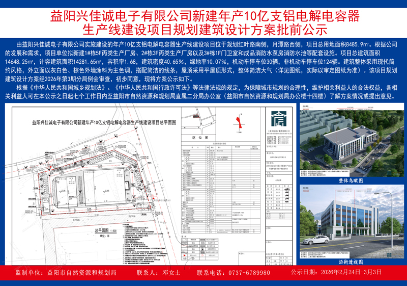 益阳兴佳诚电子有限公司新建年产10亿支铝电解电容器生产线建设项目规划建筑设计方案批前公示