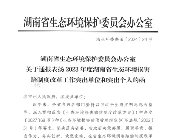 近日,湖南省生态环境保护委员会办公室发布《关于通报表扬2023年度湖南省生态环境损害赔偿制度改革工作突出单位和个人的函》,对2023年全省生态环境损害赔偿制度改革工作中30个团结协作、开拓进取的突出单位和45名恪尽职守、爱岗敬业的突出个人予以通报表扬。益阳市生态环境局高新区分局姚林同志获生态环境损害赔偿制度改革工作突出个人表彰。
