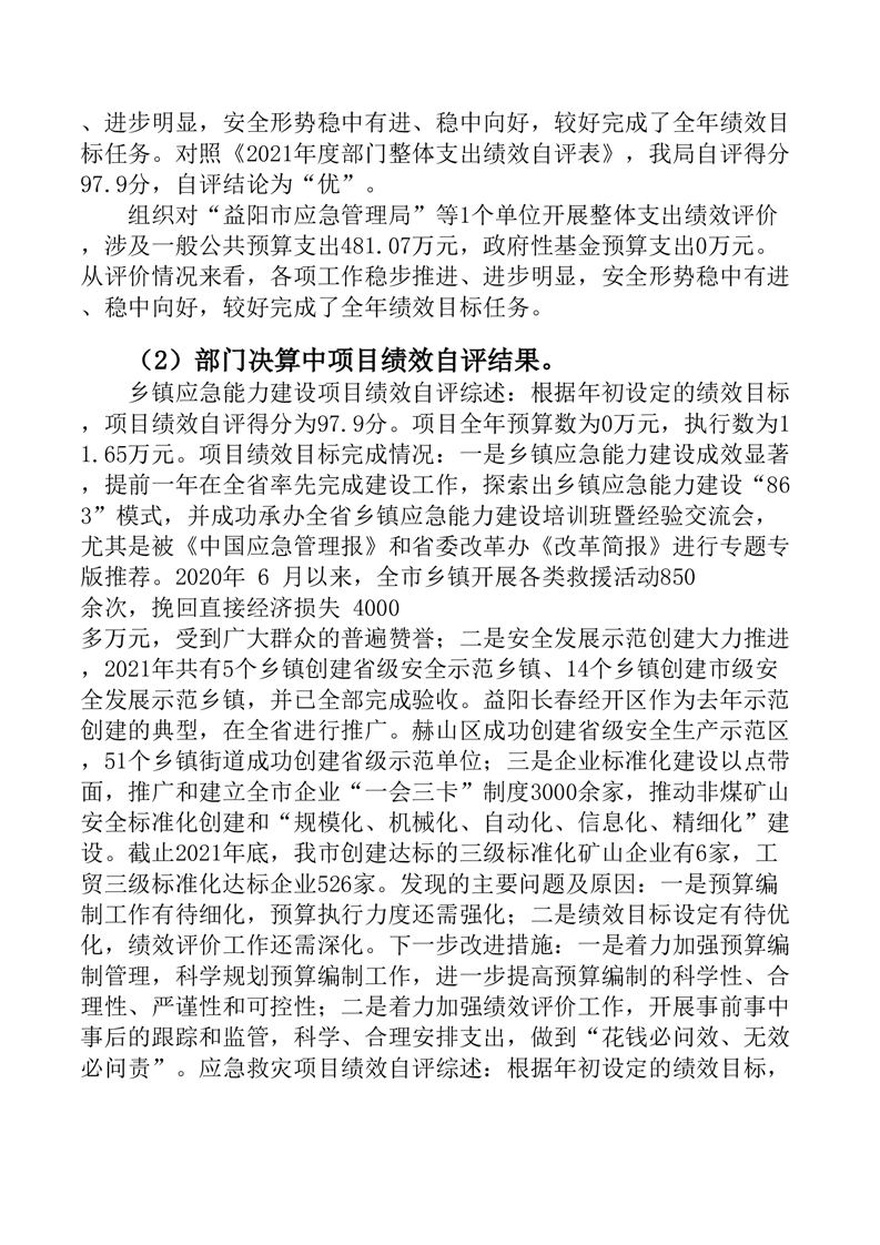 益阳市应急管理局2021年度部门整体支出绩效自评报告.doc