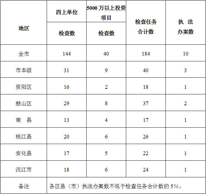 巩固全市及各区县(市)统计执法检查成果,开展全市统计执法办案“清零行动”。各区县(市)统计局按照在库“四上”单位数不低于5%、5000万以上投资项目数不低于4%的比例确定年度执法检查单位最低任务数量(详见附件),开展常态化执法检查。各区县(市)统计局要加强执法检查的针对性,严肃查处统计违纪违法案件。