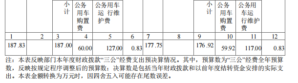 2、公务用车购置费及运行维护费支出预算为187万元,支出决算为176.92万元,完成预算的94.61%,与上年相比增加20.33万元,增长12.98%。其中: