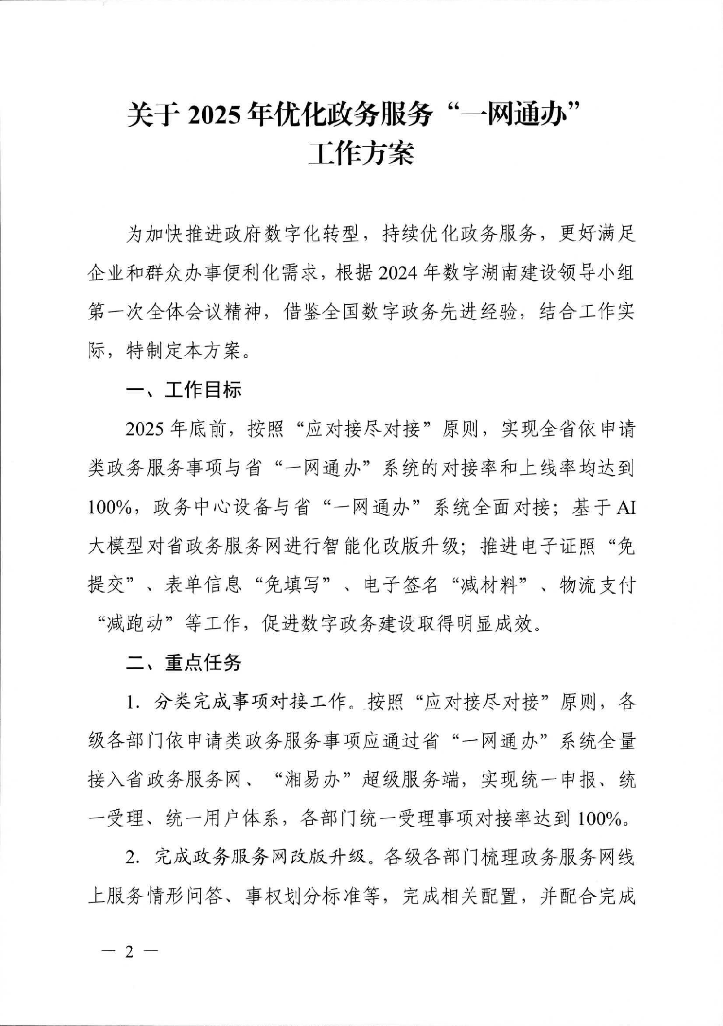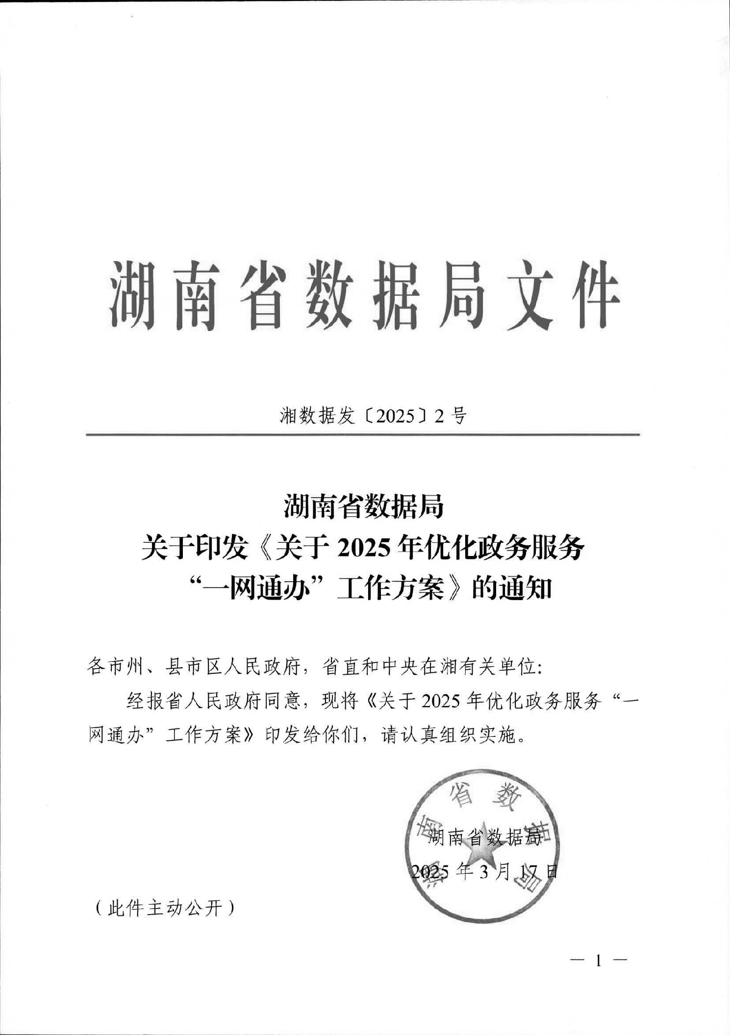 湖南省数据局关于印发《关于2025年优化政务服务“一网通办”工作方案》的通知