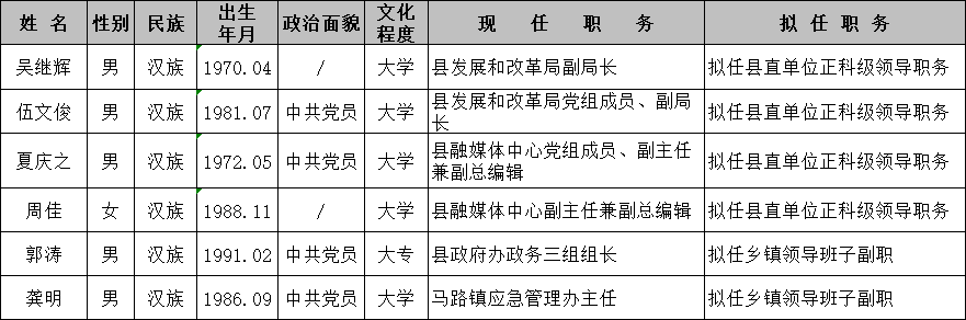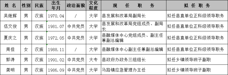 为了加强对干部选拔任用工作的监督,提高识别和任用干部的准确程度,现对县委常委会议研究决定的拟任职人选(提名人选)进行任前公示。