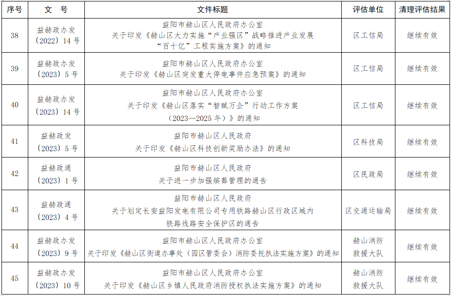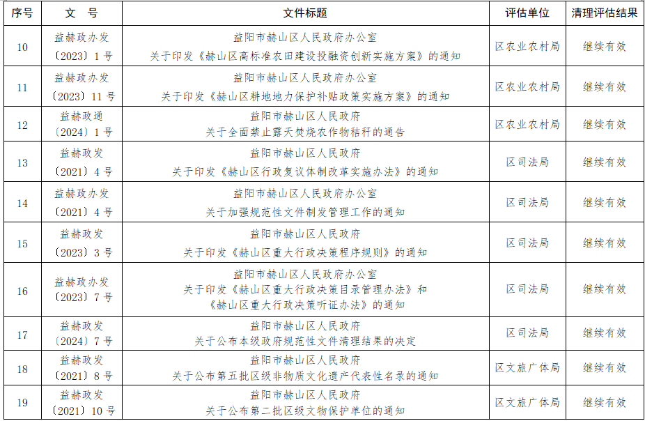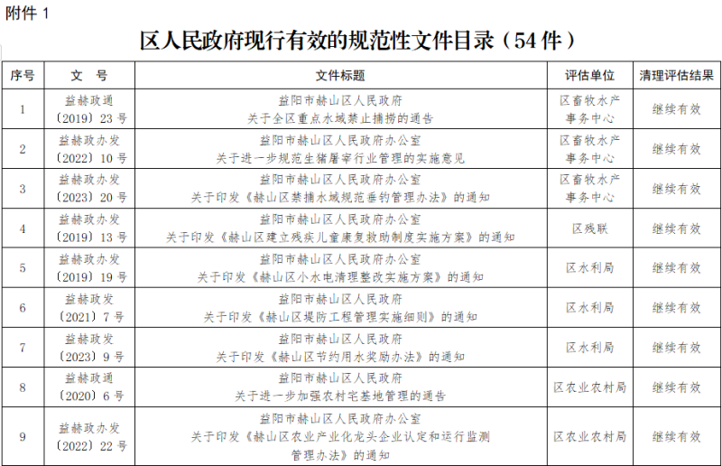 一、现行有效文件:《益阳市赫山区人民政府关于全区重点水域禁止捕捞的通告》(益赫政通〔2019〕23号)等54件规范性文件(详见附件1),因文件尚在有效期之内,需继续沿用,并且其制定主体、权限、程序、内容、形式均合法,现确认现行有效。