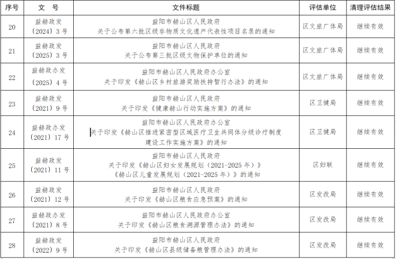 二、重新公布文件:《益阳市赫山区人民政府关于公布全区古树名木保护名录的通知》(益赫政发〔2019〕7号)等5件规范性文件(详见附件2),因文件有效期已经届满或即将届满,经评估确认文件有继续保留的必要,并且文件内容合法,经研究确认重新公布,重新公布的文件其有效期自本决定公布之日起重新计算。