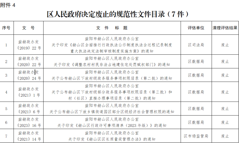 四、废止文件:《益阳市赫山区人民政府办公室关于印发<赫山区全面推行行政执法公示制度执法全过程记录制度重大执法决定法制审核制度实施方案>的通知》(益赫政办发〔2019〕22号)等7件规范性文件(详见附件4),虽在有效期内,但其主要内容与法律、法规、规章以及上级规范性文件的规定不一致,或依据的法律、法规、规章和上级规范性文件已废止或失效,或不符合优化营商环境的有关规定和违反公平竞争原则,或不适应现实需要,无继续实施的必要,现予以废止。