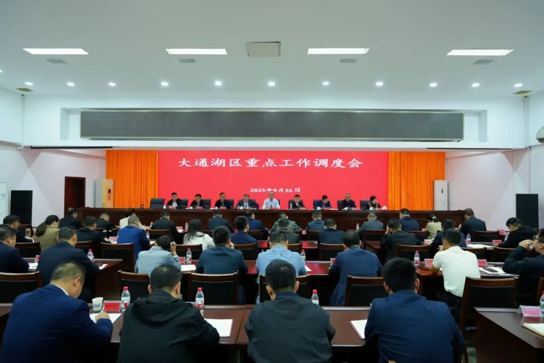 9月26日上午,大通湖区重点工作调度会召开,区委书记王新宇讲话,区委副书记、区长罗立峰主持会议。