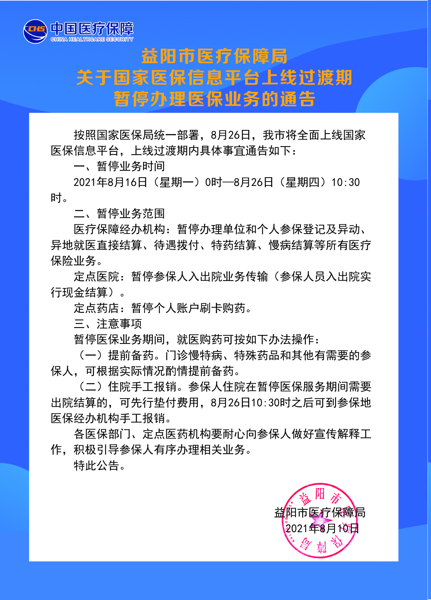 注意,因系统切换,16日凌晨起,益阳暂停办理医保业务