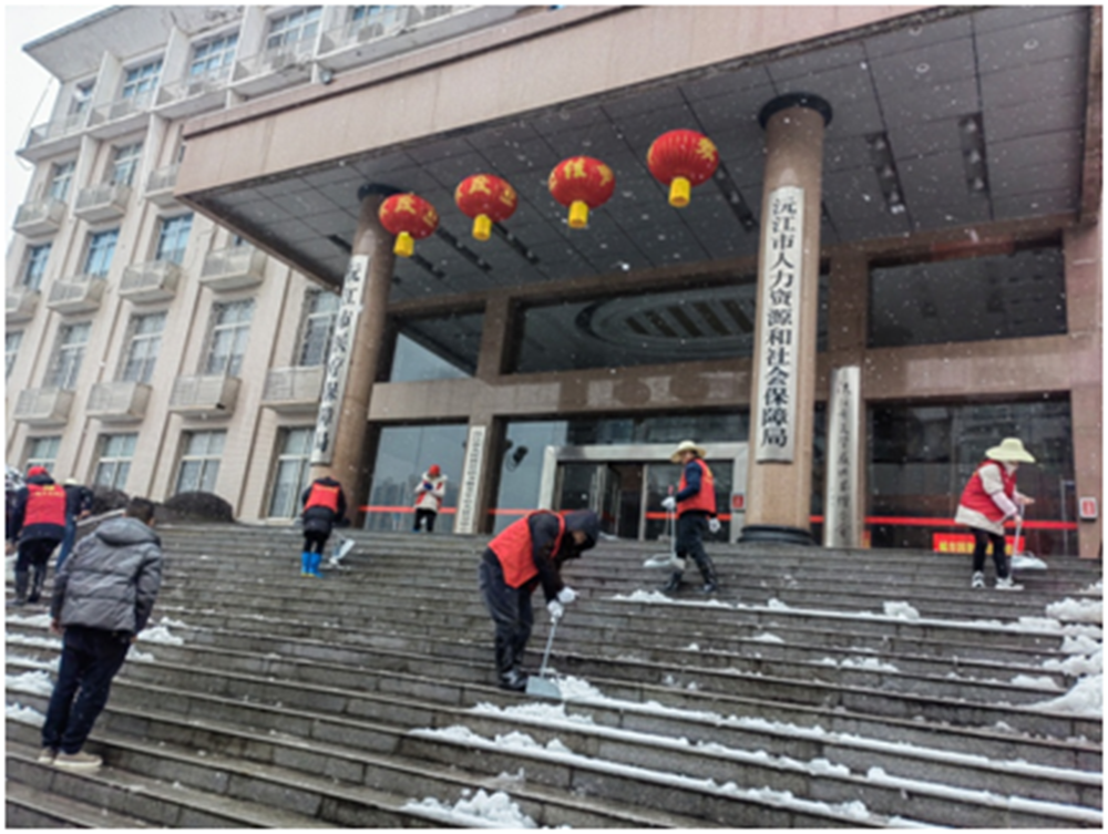 一大早,机关庭院是干部职工上班出行重要场所,也是群众办事重点区域。为确保道路通畅及行人、车辆出行安全,沅江市医疗保障局组织干部职工手拿铲子、扫帚,在机关庭院内开展融冰除雪,全体干部职工配合默契,干得热火朝天,经过近2小时的活动,在冰雪大地中清扫出一条整洁干净的“平安路”。